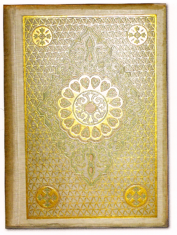 Minsky also does a fine job of outlining the importance of women artists, who figured prominently among the designers of the era. Both Sarah Wyman Whitman and Alice C. Morse are represented by handsome specimens of their work. Morse’s binding for Chronicle of the Conquest of Granada by Washington Irving (left) is particularly splendid among the other non-pictorial bindings, and could nearly pass for a more expensive custom binding by one of the great European binderies like Sangorski and Sutcliffe.