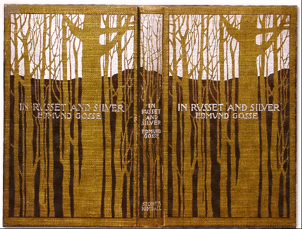 Screens of silhouetted trees (an Arts-and-Crafts-era favorite) figure prominently among the compositions, one of the best being Will Bradley’s 1894 binding for In Russet and Silver by Edmund Gosse (right). Bradley played intelligently with the limits of two-color stamping, making the russet cloth an active element of the design (rather than mere background) and using silver and black foils to represent the sky and hillside beyond the brown trees.